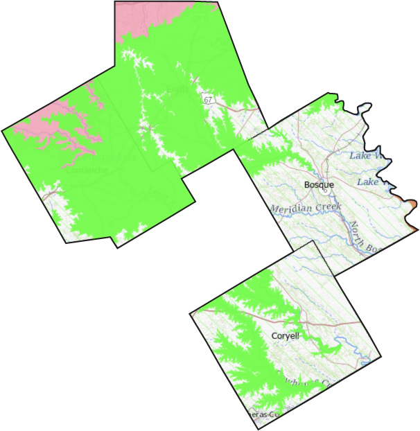 Groundwater is a finite, or limited, resource that is found within the pore spaces of the aquifer formation. As the water moves through the connected spaces it is filtered through the formations of the aquifer. Some formations of the Trinity transfer water faster than others due to the material found in the formation. Recharge rates also vary. Comanche and Erath Counties lie within the aquifer recharge zone where water levels can rise relatively quickly following a precipitation event. When a rain event occurs throughout Bosque or Coryell County, the recharge rates are much slower due to the vast limestone formations.